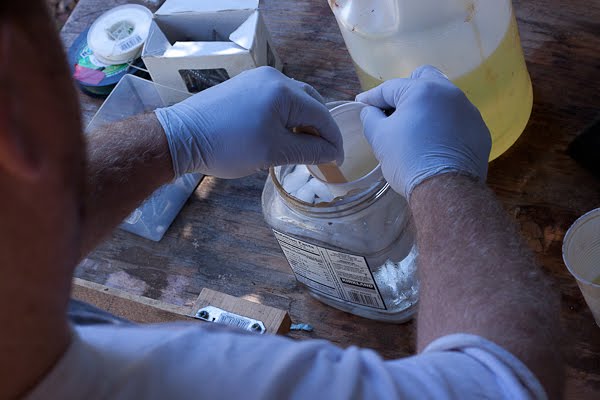 Mixing epoxy on hot days requires an ice bath to keep things from kicking off too quickly.